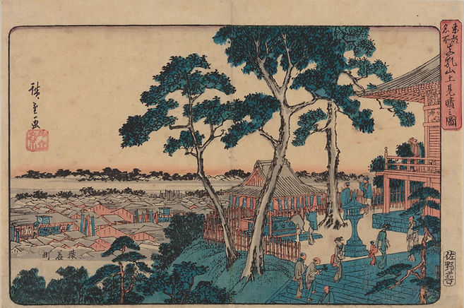 待乳山より猿若町を望む。大根を手にした参拝者が階段を登り当山を代表する浮世絵。山上の手水屋には、当時評判の坂本屋の白粉「仙女香」の銘が見える。この水源は、江戸後期には涸れ井戸となった。山の下には、天保の改革で移転してきた歌舞伎芝居の町「猿若町」が見える。芝居小屋2つは、櫓の紋から左から市村座と河原崎座であろうか。*東都名所34枚組の1図。